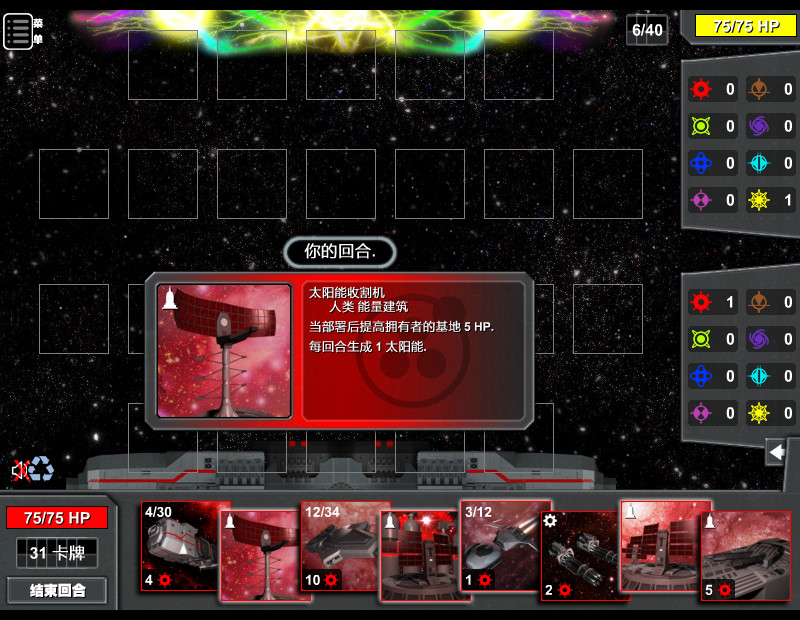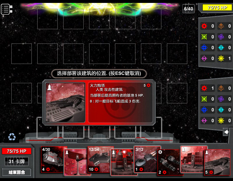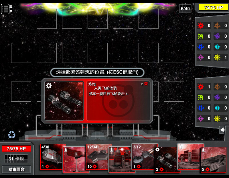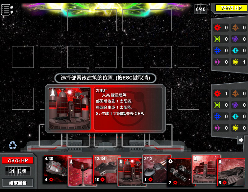 这个游戏里发射飞船需要对应的能源,能源则来自于各个种族的能源建筑。一般来说,建造基础能源建筑不需耗费能源,产能为1点,具有一项特技。高级能源建筑产能为2点,建造需要耗费一定的能源。同时每个种族还有特殊建筑,功能各异,如人族的炮塔可以补刀,CA的Adelan装置可以打爆对面的建筑等等。