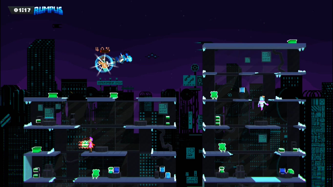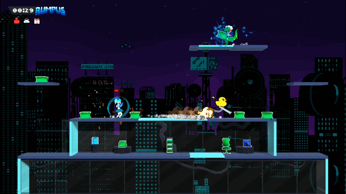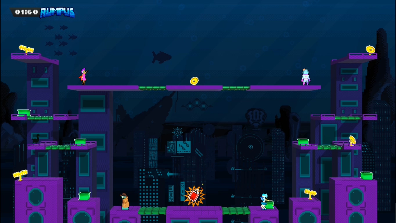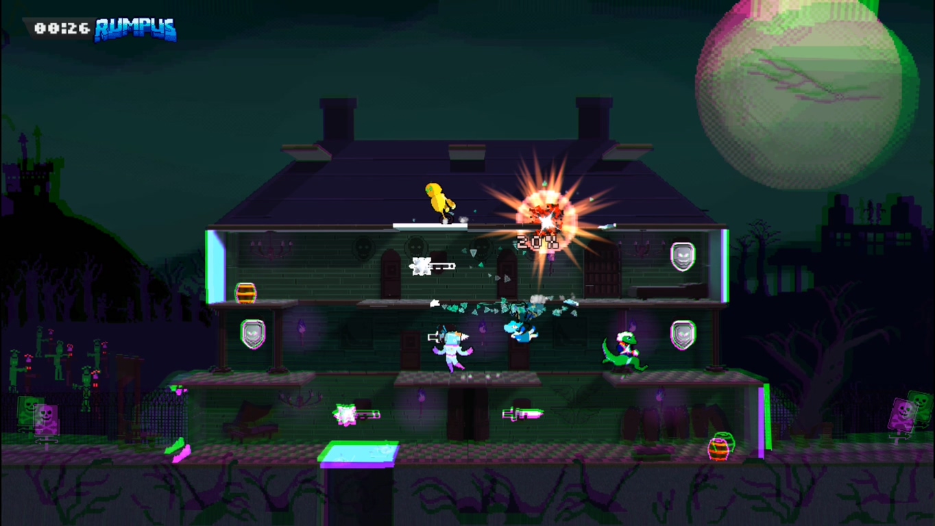 《骚乱(Rumpus)》是由Polyraptor Games制作的一款动作冒险类游戏。不知道大家小时候玩过雪人兄弟没有,这款游戏给小编的感觉就是这样的,在一个平面的空间内玩家控制主角开始自己的冒险,大乱斗式的玩法十分刺激有趣。另外游戏中玩家能够使用很多道具和特殊技能的人物,玩家能够自由搭配他们,玩起来还是很不错的。