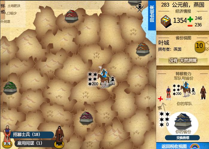 《春秋战国2(two powers 2 to rule China)》是一款回合制战旗策略游戏。招兵不花钱,养兵花钱,如果常驻士兵守城,那养兵费肯定是不够花的,所以只在得到敌人进攻情报下才派兵派将领守城,最重要是养成本回合内没需要不要增兵的习惯。