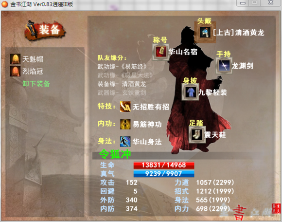 顶级门派:泰山派,日月神教吸星套,古墓黯然套,九阴降龙套,散人太玄套,散人野球拳套,打狗太玄无招套,血刀门。