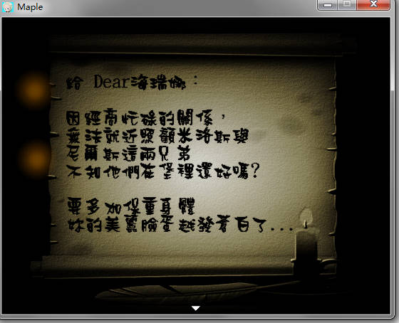 《Maple(Maple)》是由selracxu制作的一款探索解谜类游戏,游戏讲述了传说有个种族叫“斯纳特族”,而拥有奇异力量的族人们,在一场巨变之中纷纷被灭绝,只遗留下两个孪生兄弟。赫兹古堡的主人“马尔默特”伯爵,为弗亚尼奥镇的三大富豪之一,某日,赫兹古堡却突然垄罩著巨大的阴影,到底是何原因所导致?真相如何?等您来探查...