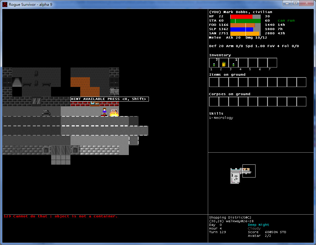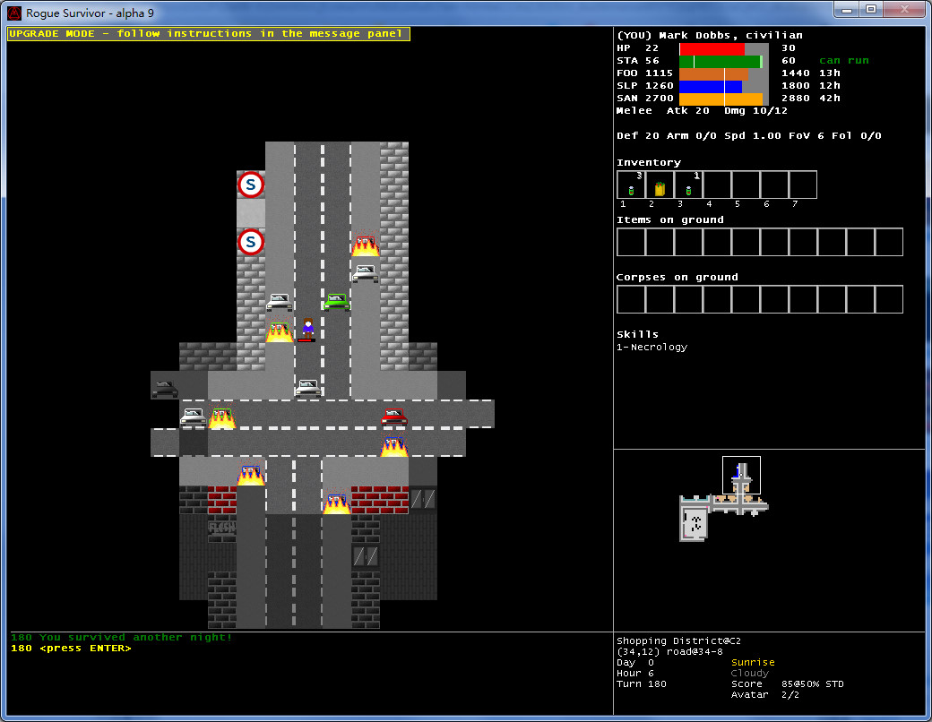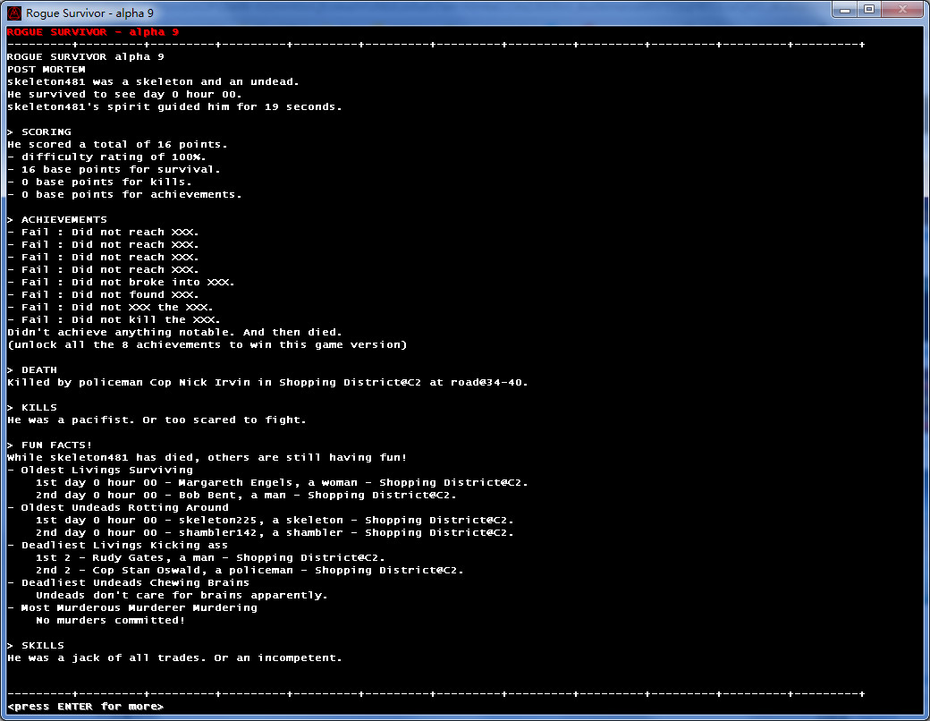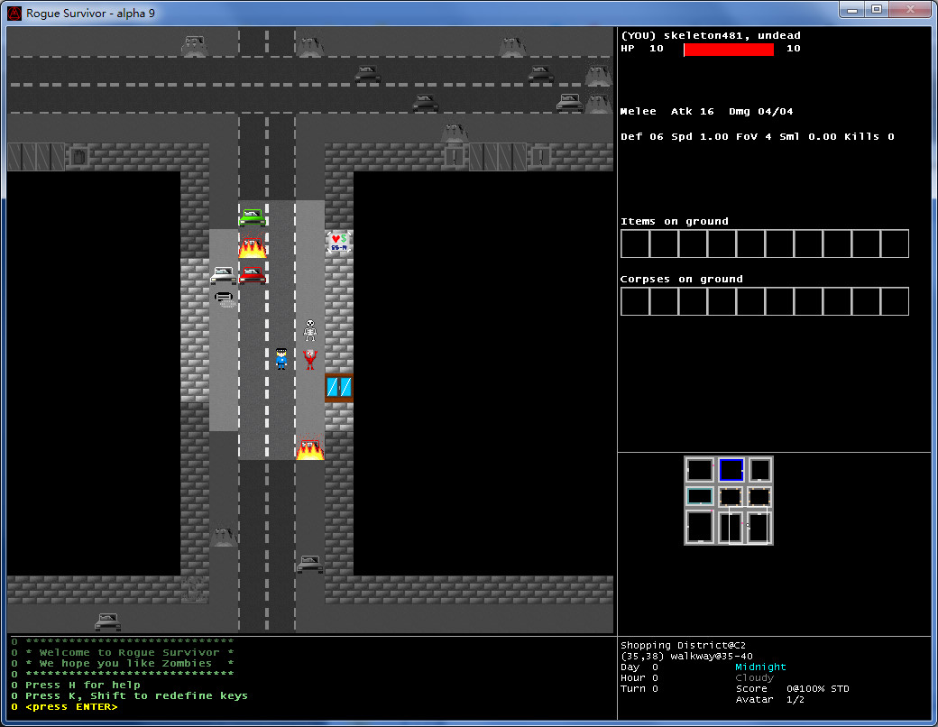 玩家可在开局选择扮演人或僵尸的身份。游戏以攻击敌人为目标,最终在充满僵尸群的情况下生存到最后的人胜出。开局可以扮演人或僵尸,与一般roguelike不同,这游戏杀敌不升级,每过一天就升一级生命不会自动回复,尽量避免肉搏