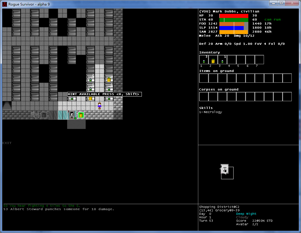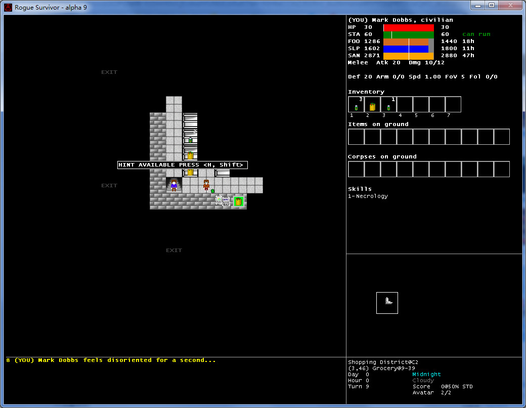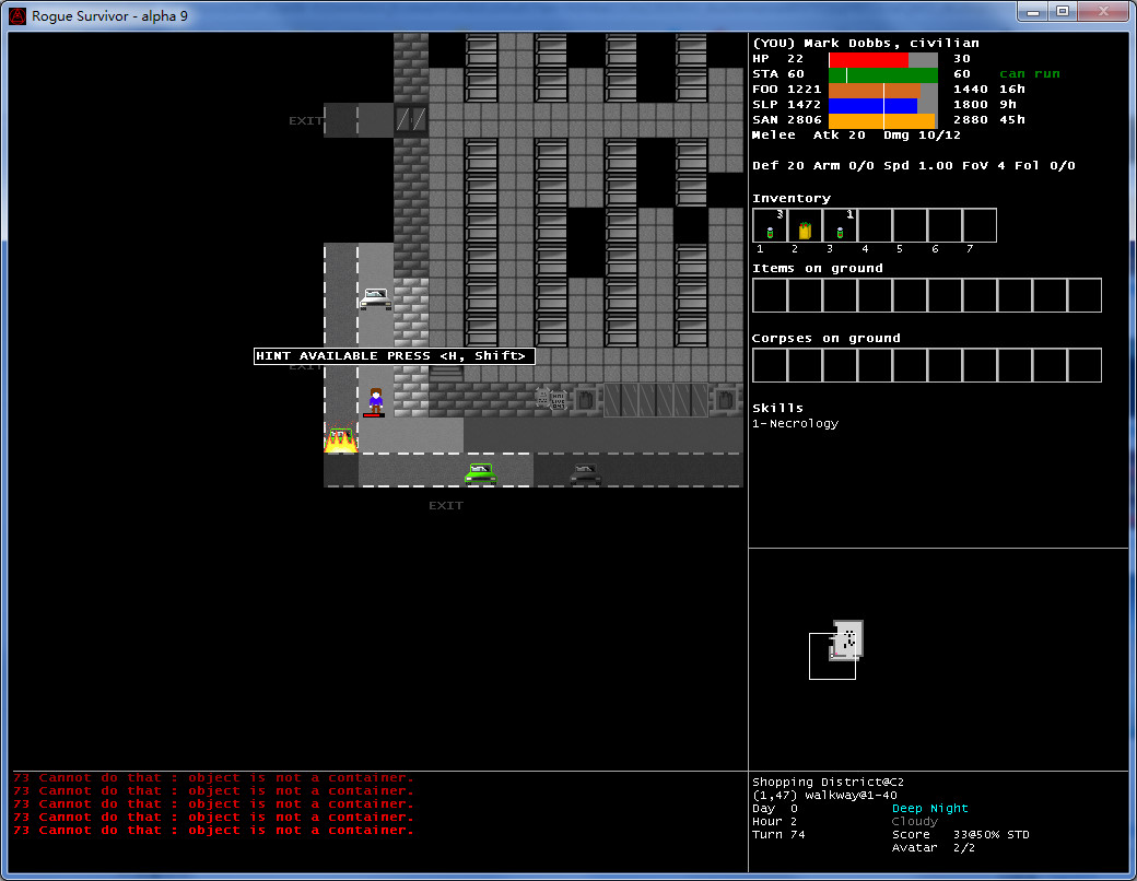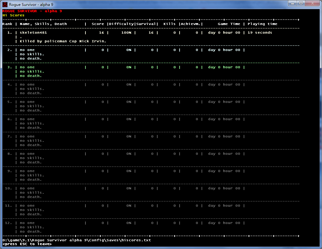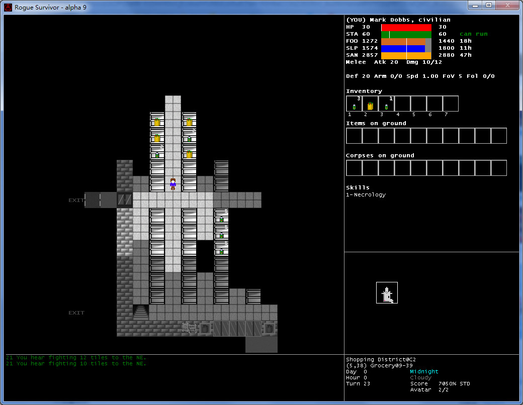 玩家可在开局选择扮演人或僵尸的身份。游戏以攻击敌人为目标,最终在充满僵尸群的情况下生存到最后的人胜出。开局可以扮演人或僵尸,与一般roguelike不同,这游戏杀敌不升级,每过一天就升一级生命不会自动回复,尽量避免肉搏