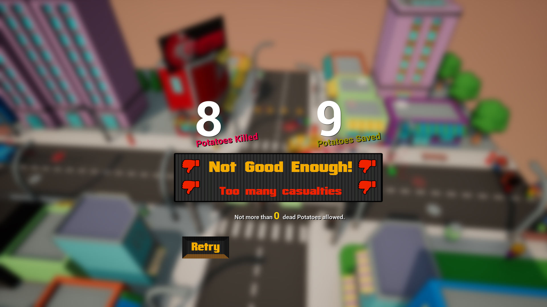 玩家需要在大街上制造混乱,当然,这不是让你去制造混乱的,玩家需要拯救即将被撞上的行人,尽可能减少人员伤亡,游戏采用过关模式,拥有更多的AI等你来拯救。