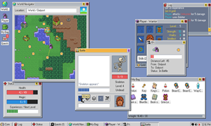 从游戏画面上来看,《王道》就像是一个老式操作系统的界面。它的另类之处在于它将游戏中的各个信息面板都做成了电脑窗口的形式。人物状态、背包物品、战斗界面等,都被分割为一个个独立窗口。