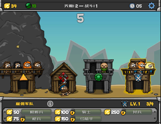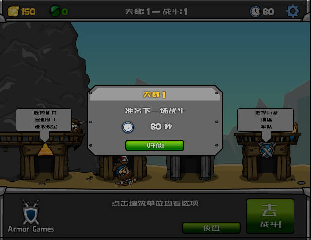 游戏开始后玩家可以看到四个建筑,点击任何一个建筑就会开始计时,每次的操作时间只有60秒,60秒后敌军就会来犯。