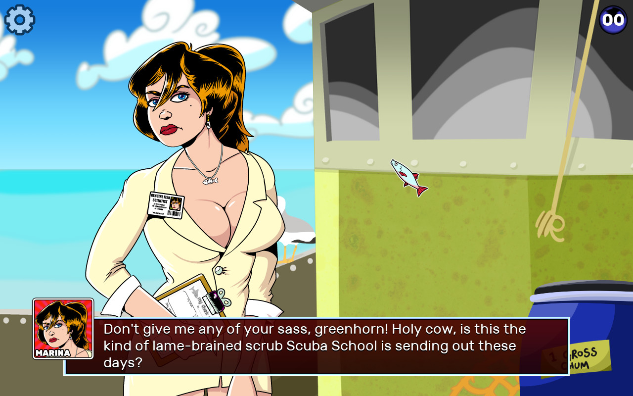 这是一款视觉小说类游戏,你将扮演一位潜水学校的毕业生,受老板Marina的委托,下水去探索失事的“金翅号”轮船,Marina是一位“鱼类科学家”,你会在路上遇到会说话的鱼,当你达到失事船只时,你就遇到了“可爱的巨型大白鲨娘”Shark Chan,你的终极目标就是攻略这鲨鱼娘并且赢得她的芳心。