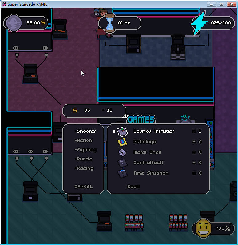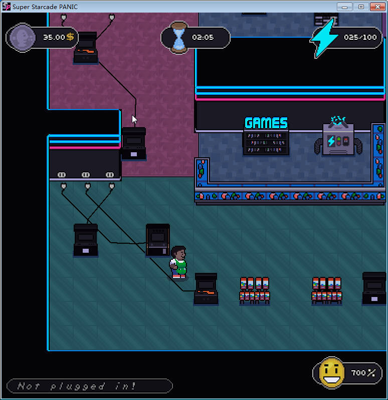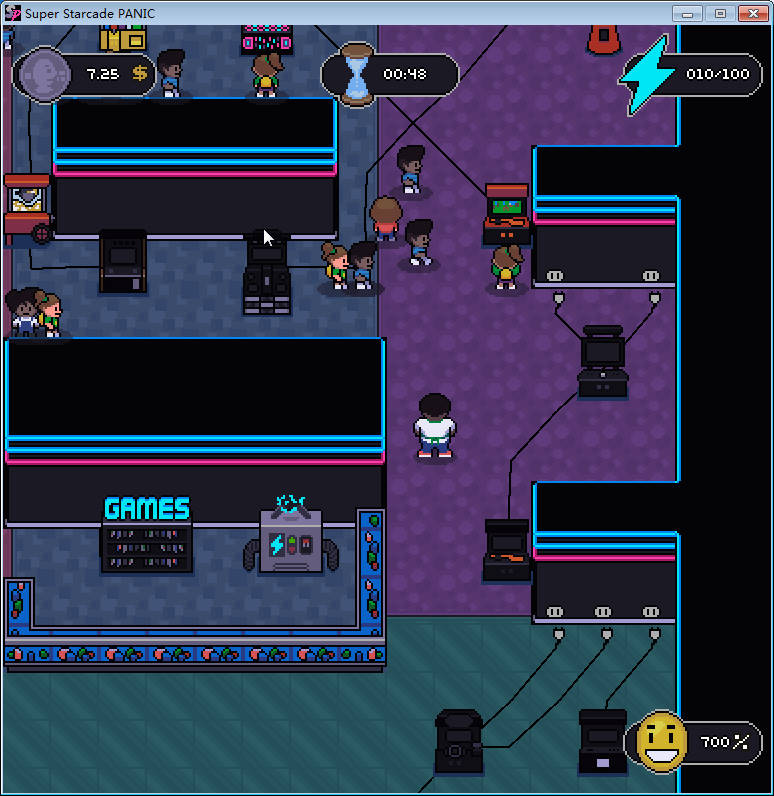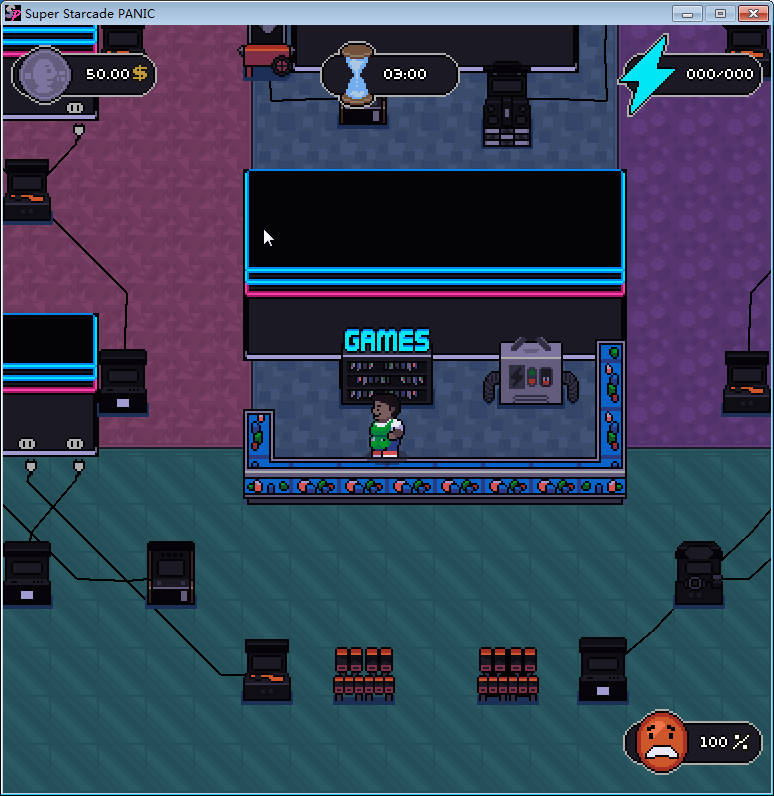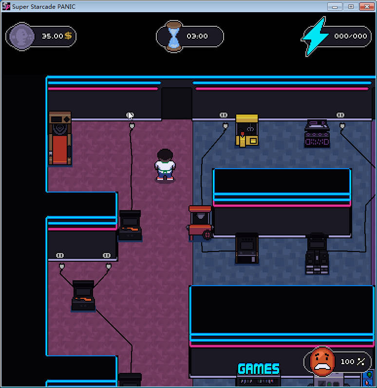 1人《超级明星PANIC(super starcade panic)》是由Ellian,FatBard和Melanie Severs三人制作的一款模拟经营小游戏。你管理这一个游戏厅,购买设备建设它以便吸引更多的孩子来玩,确保你的游戏厅能营业到80年代!