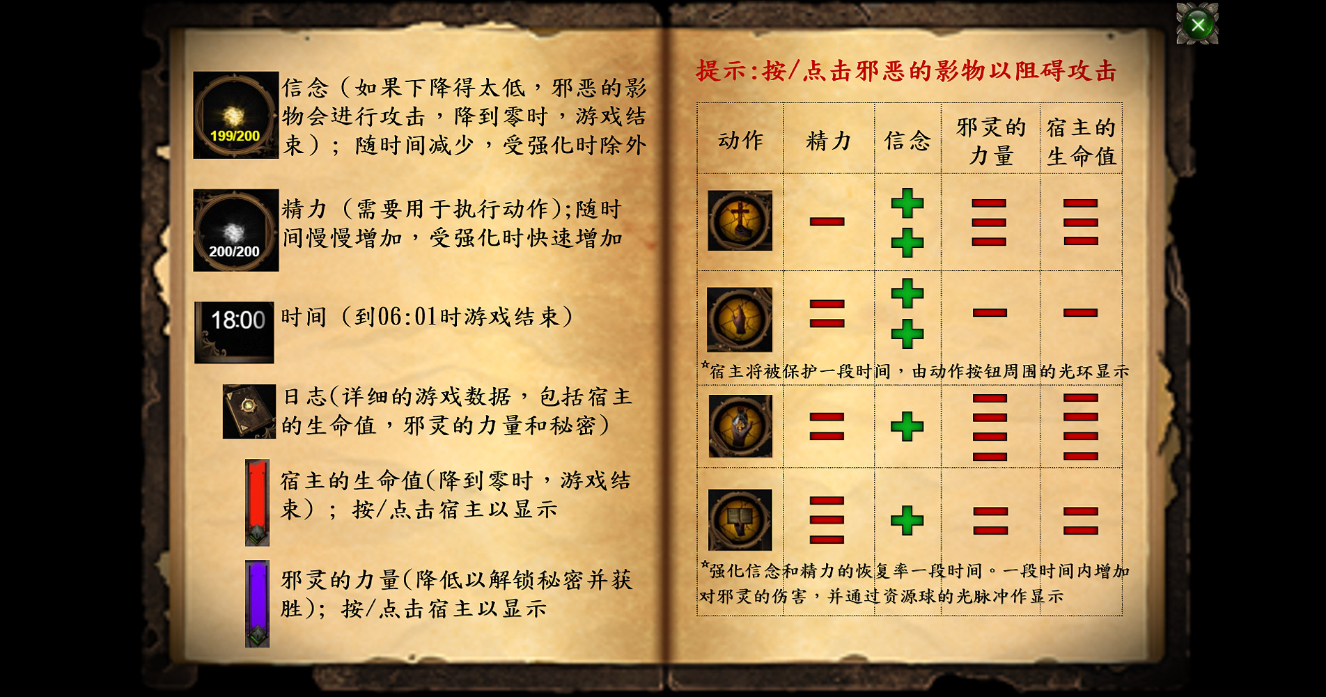 每个行动对宿主和邪灵都有不同的影响,并有自己的优点和缺点。 尝试发展自己的动作组合,在黎明前驱逐邪灵,同时防止宿主死亡。