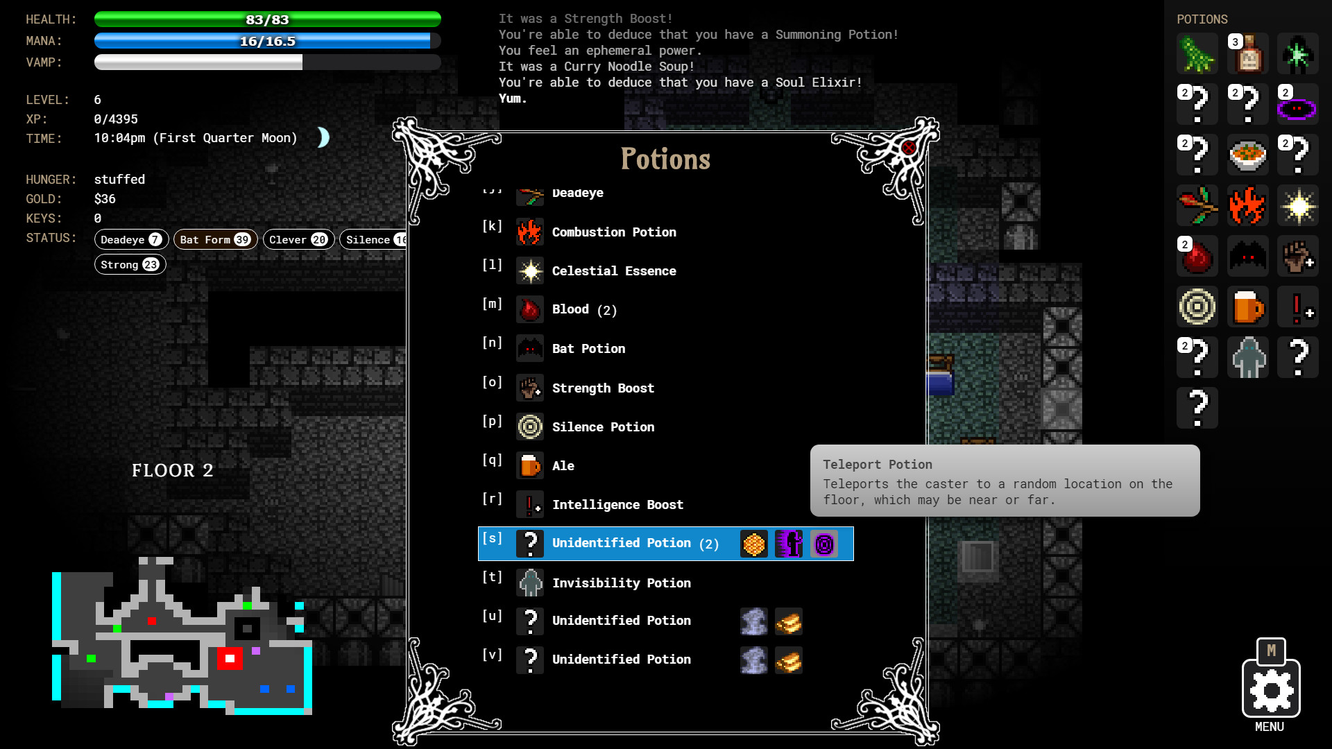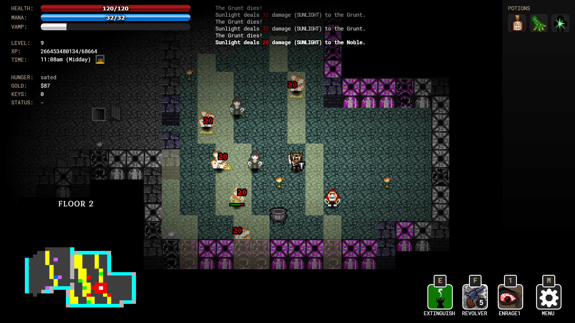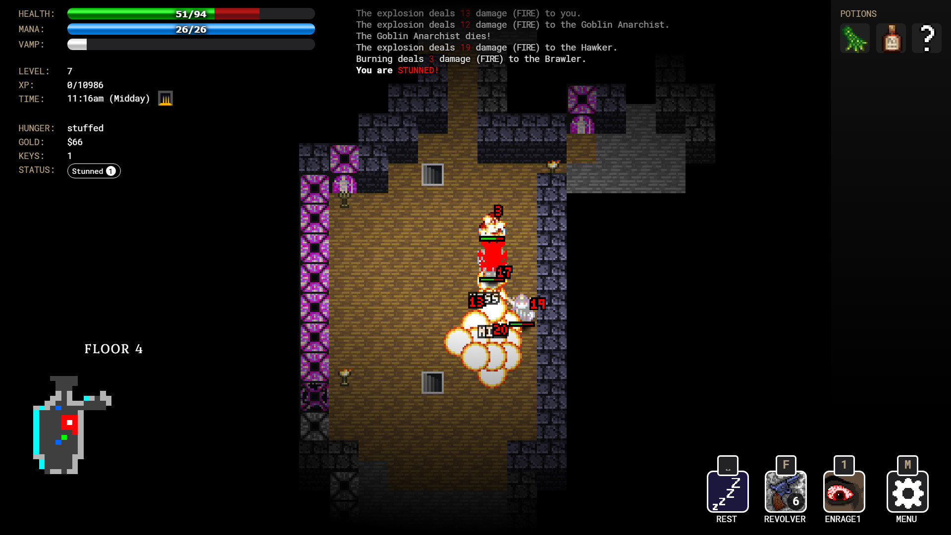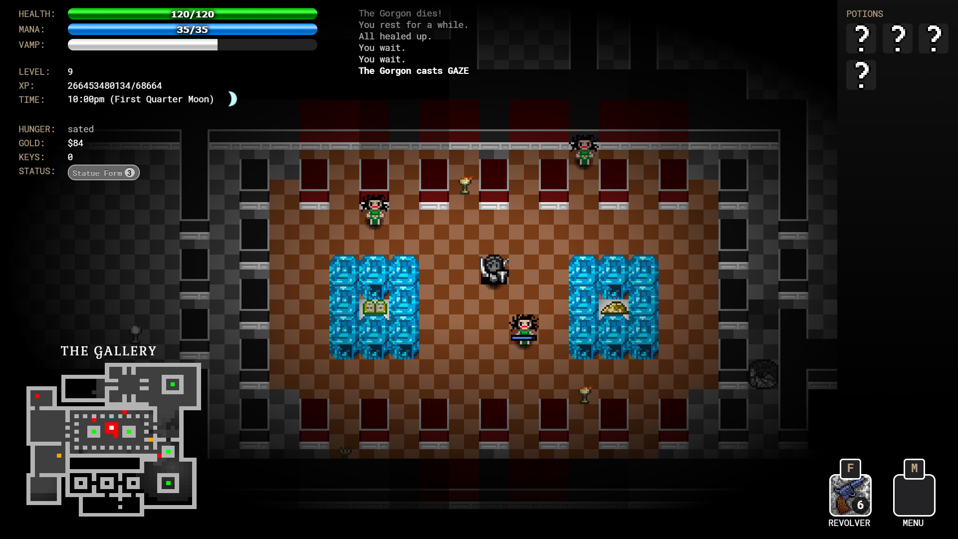 Roguelike游戏里的时间,或者说轮数,通常与“饥饿度”挂钩。比方说,每过一百轮饥饿度上升一级,以此迫使玩家人物探索地城,寻找食物。在《旅馆》里,时间不但影响饥饿度,而且与昼夜循环和月相变化有关。