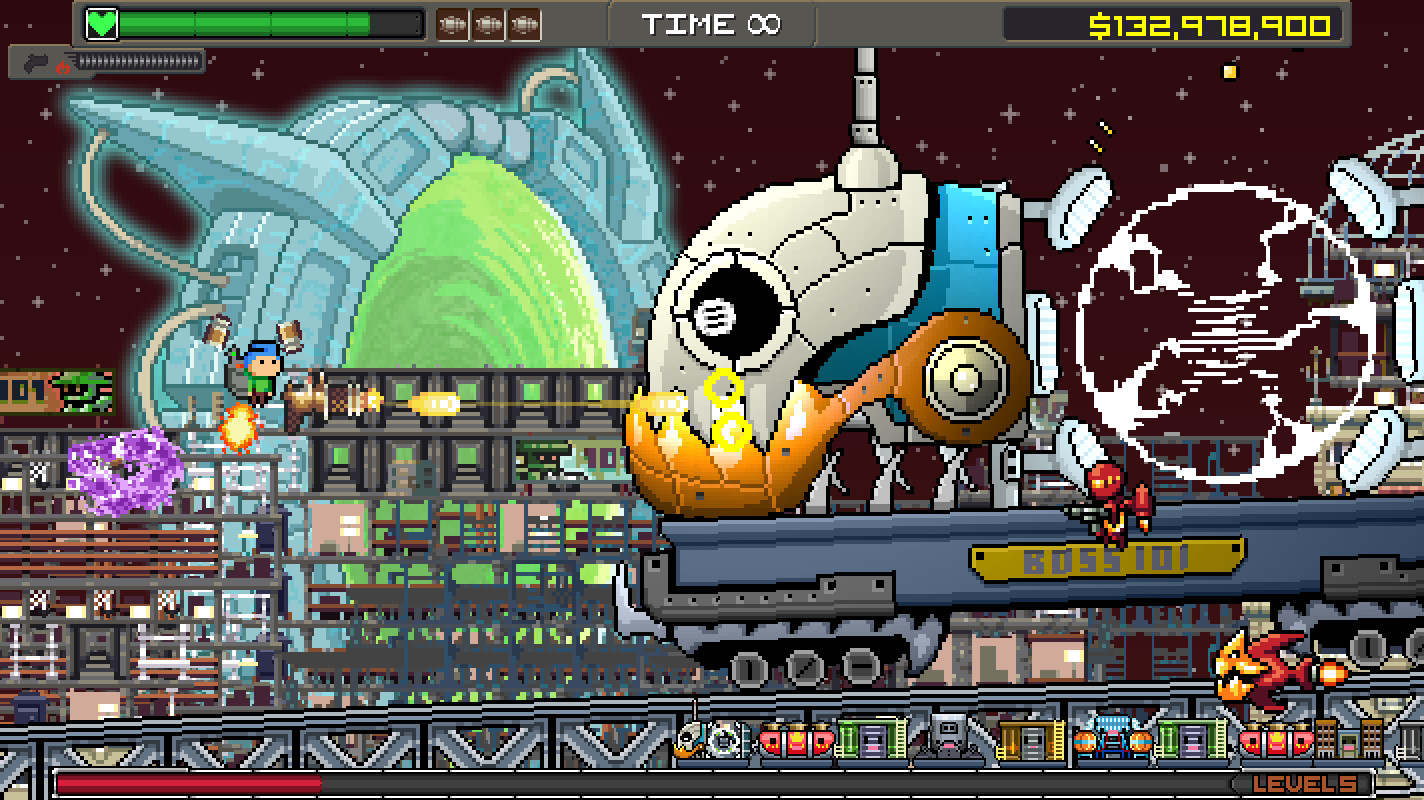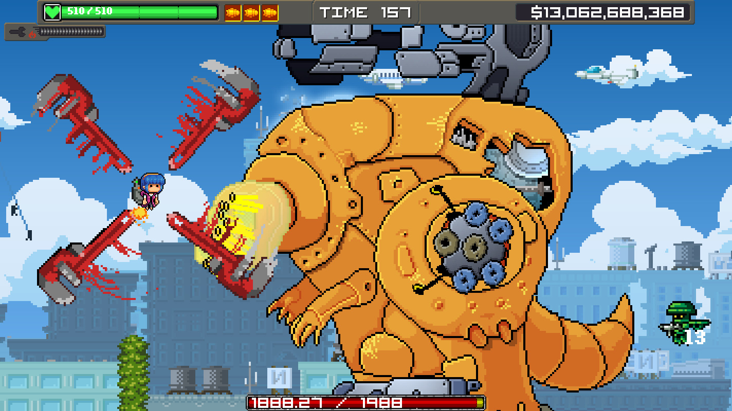 一款像素风的横版射击类冒险游戏,相信很多玩家都玩过类似的作品,其主要的玩法方式就是通过完成各种各样的任务来获取奖励,这些包括金币、武器、道具等等,而且金币可以用来升级武器和技能。玩家将与各种各样的机器人战斗——动物、武士、外星人和恐龙!一切都是那么的科幻,你该如何面对?
