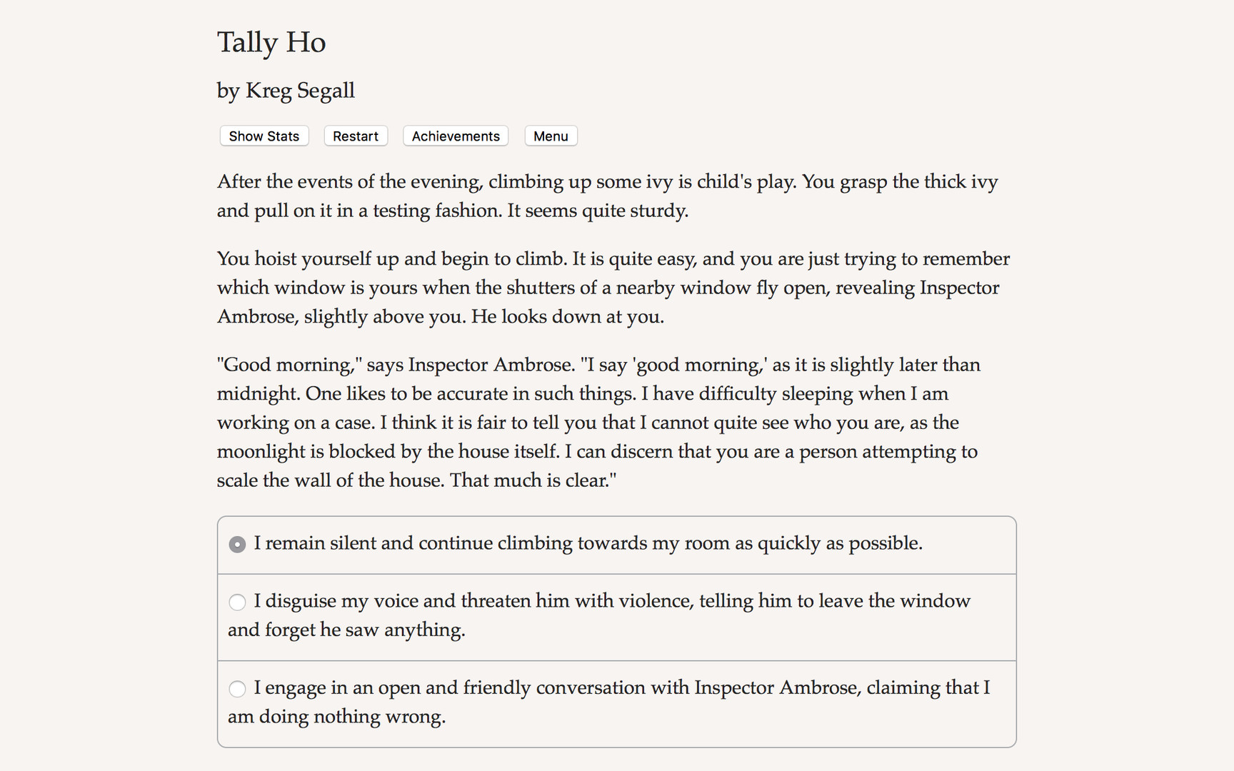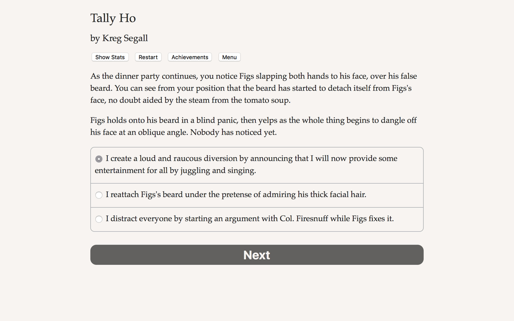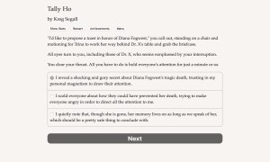《Tally Ho》是一款由Choice of Games制作发行的冒险解谜类游戏,玩家在游戏中扮演一个家族的管家,需要解决家族成员一系列的事情,你可以选择故事的发展路线,或好或坏,亦正亦邪,全看你的意愿。小伙伴们快来瞧瞧吧!!!