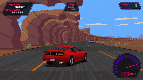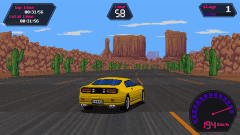 这款游戏并不是完全模仿90年代的街机赛车游戏,而是充分利用像素艺术以及子图缩放等图形技术;