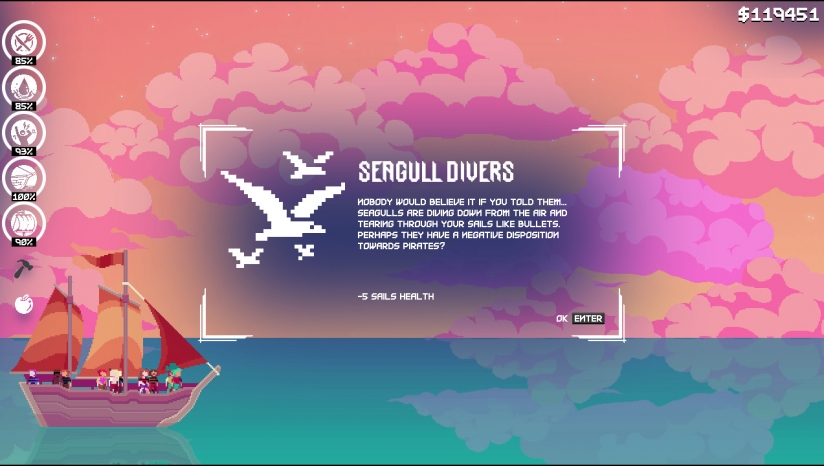 7人《不要下沉(Don't Sink)》是Sebastian Nigro, Christopher Anselmo, Daniel Marques制作的一款2D像素风格的角色扮演游戏。在游戏中,玩家将扮演一名船长,在大海上航行,你会遇到各种危险和突发事件,你必须要保证自己的船能在海上正常航行。