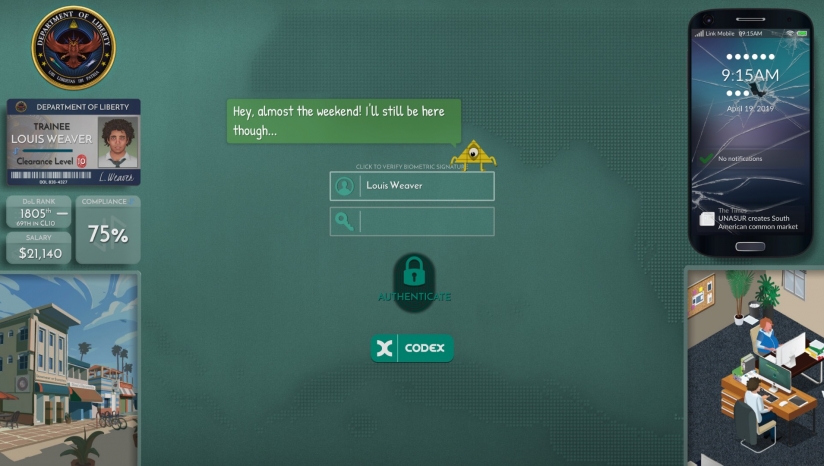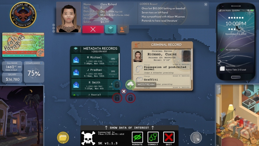 玩家所扮演的角色是类似于国家安全局之类的政府安全部门员工,任务就是研究分析浩如烟海的资料,找出那些对国家和人民有害的坏蛋们;玩家要利用各种手段去调查目标的一切情报,出行记录、银行账户资料以及其他的各种资料,并从这些资料中分析判断一个人是否有嫌疑,并针对性的做出下一步的决策。