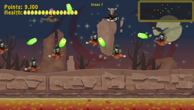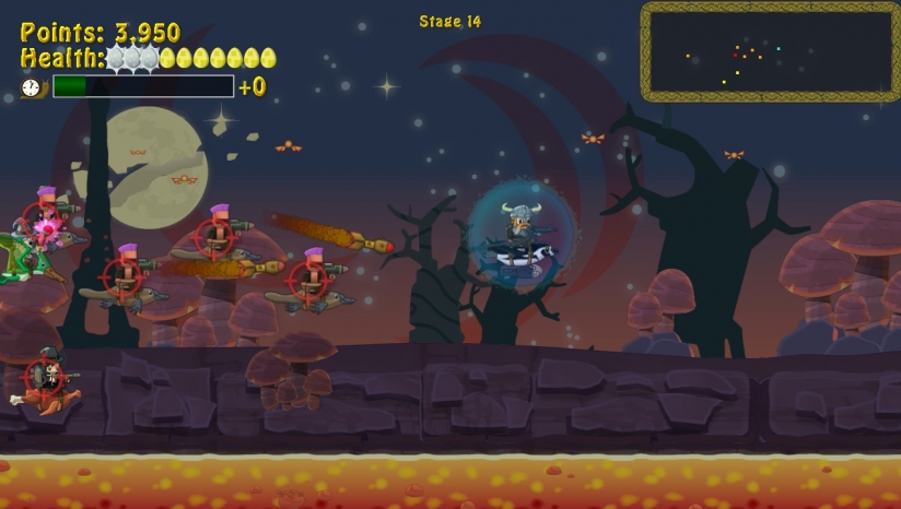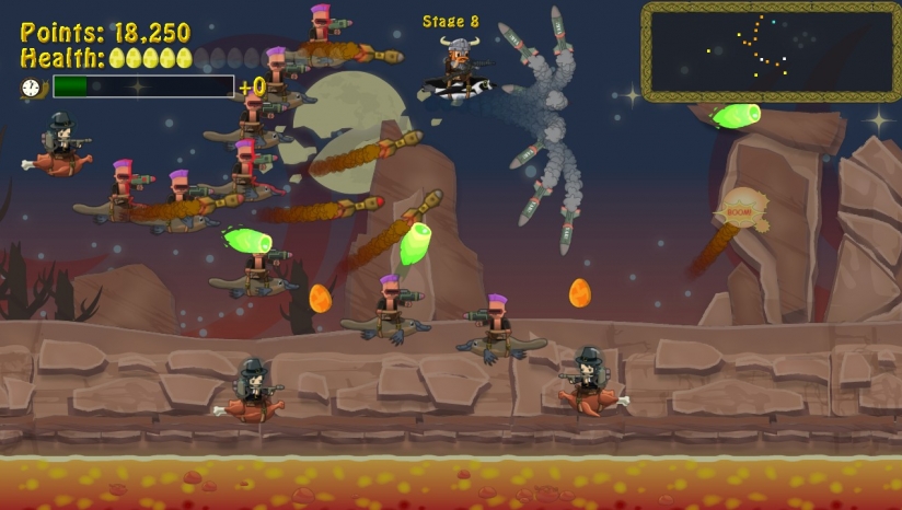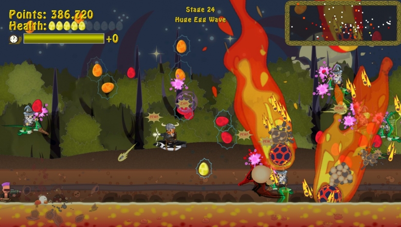 真正的诀窍是如果你错过了鸡蛋会发生什么。当鸡蛋击中熔岩时,它会产生一个新的敌人,而新的敌人将比原来的敌人更坚韧。你必须杀死敌人,但一定要抓住那些蛋,否则你会把事情弄得更糟。