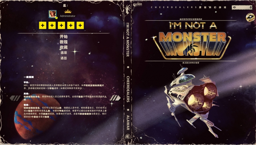 《我不是怪物(I’m not a Monster)》是Cheerdealers制作的一款复古未来主义的多人回合制策略游戏。游戏融入了桌游“狼人杀”的元素。玩家角色随机分配。 建立一个团队性的策略,但是不要急于相信你的队友!研究玩家的每一步行动,尽快找出怪物,拯救平民并消灭怪物。尽可能多地收集飞船各处的武器,搭配不同的武器,可以让你取得独特的能力,这甚至可以帮你一举逆转战局。但请注意,如果你被怪物寄生,那么请务必在三步内治疗自己,否则你自己也会变成怪物!