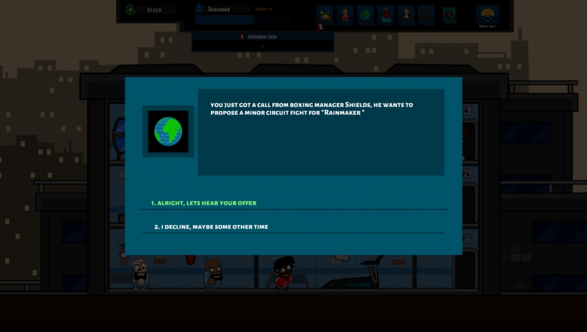 17人《拳击学校(Boxing School)》是一款管理拳击学校的模拟经营游戏。在游戏中你需要雇佣拳击手来为自己比赛,教他们去如何攻击对手并获得更高的段位。游戏采用了十分搞笑有趣的动漫画风,玩家将在放松的氛围之下来对手下的战士进行调教,争取让他们早日站在世界之巅。