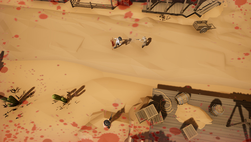 当你开始一个单人游戏时,你的角色会发现自己身处一个拥有武器库的小镇中间,其中包括手枪,霰弹枪和步枪,以及有限数量的弹药。敌人开始从各个方向来!他们中的大多数都会有枪械,还有一些人会带着刀进来。由于你的每个枪(枪,霰弹枪和浅滩)都有一定数量的子弹,你需要确保每次射击击中目标。如果射击太多树木或仙人掌,或只是击中地面,你将不得不重新加载并躲避传入的子弹以便生存。当你击倒对手时,有些人会留下弹药或电源。获取它们所需要做的就是将鼠标悬停在图标上(加电或弹药)。清除区域后,角色需要在地图中找到红色拱形以进入下一部分,此时该过程将再次开始。