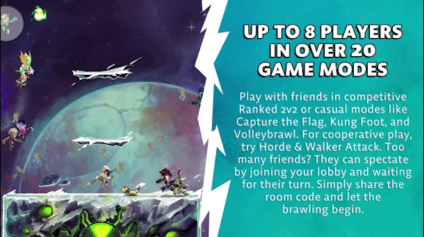 《格斗哈拉》是一款2D卡通风格的格斗游戏。玩家将操控风格各异的角色,在不同场景展开热血格斗,目标是把对手从舞台上击落到台下。游戏有1V1、2V2、4人混战等多种对战模式,也支持本地联机和线上对战。角色可通过几乎无限的墙跳、双段跳、冲刺和盾牌进行战斗。游戏画面清新可爱,技能特效华丽,独特的击飞获胜机制让战斗充满策略性,是一款趣味性十足的格斗游戏。