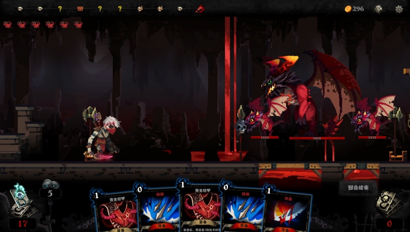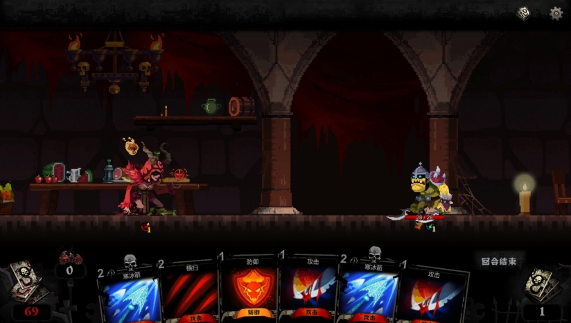 在游戏中你并没有单独的血条,而是通过你的牌库代替了你的血条,这是这个游戏最新颖的一点,当你受到敌人的攻击伤害时,游戏机制会从你的牌库中扣除等额的受到的真实伤害(因为护甲会抵消一定的攻击)数量,如果你的牌库被抵消殆尽,那么其次就会来抵消你的手牌中的牌,如果手牌和牌库都没有了,那么你也就此Game Over了。
