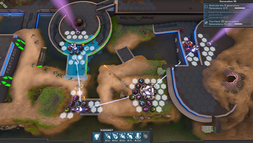 使用四个可升级的炮塔类,加上空袭和战斗机器人,以对抗Protean入侵。制定关于要构建哪些炮塔,何时升级它们以及将它们放置在六角网格上的战略决策。适时的空袭可以改变游戏的流程,但你必须等到再次使用它。在穿越Nyx系统时,为每个炮塔类解锁强大的升级。随着游戏的进行,Proteans会发展新的武器抵抗,行为和移动能力,以更好地摧毁你的防御。