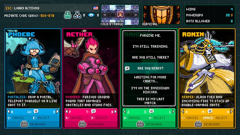 隐身英雄(Invisigun Heroes)是一个支持多人同屏的战斗竞技游戏,带着一点新元素:大家都是隐形的,当然也包括你!可预判的网格移动方式确保你知道自己的位置,而不让其余的人发觉。警觉是关键,因为脚印以及其他的干扰物将暴露那些粗心大意的玩家的行踪。使用特殊能力以及隐身枪的火力也同样会时不时暴露你的位置。再加上随机道具掉落,这些机制为你在潜行,反应,预判,欺骗以及警觉时带来好处。多种凝聚心血设计的环境效果,地图,游戏模式,以及特殊能力合为一体,隐身英雄有着很高的可玩性,易上手而难精通。