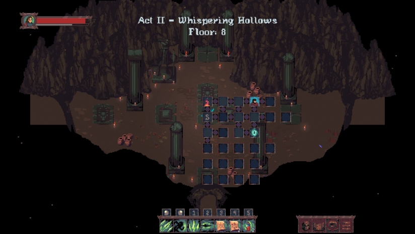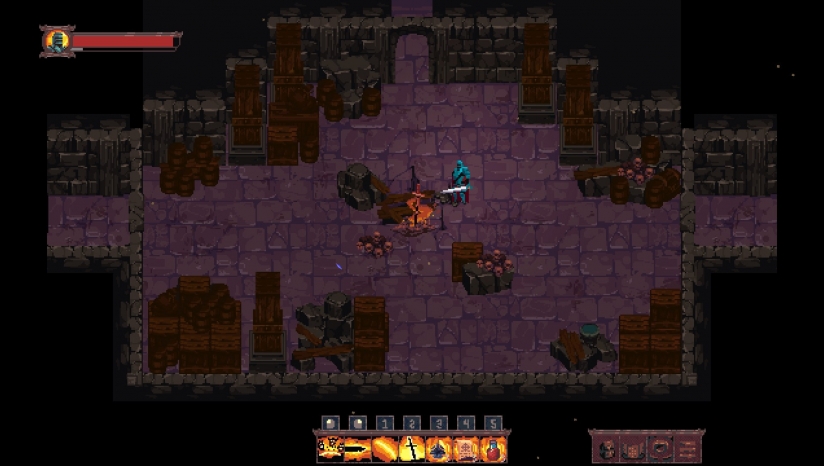 人物移动手感不太好,像是在在溜冰,惯性比较大,操作人物的击打的时需要鼠标配合指定攻击方向,有时候走位和鼠标配合不好挺容易打错方向,之后反而被敌人从背后反击掉血。游戏的打击感也不是非常好,音效配乐也很一般,BGM以悲怆沉重的风格为主,玩家有时候刚登场的那个场景中间有个篝火,再加上人物欧洲中世纪的穿着打扮,游戏好像像素版的黑魂啊!敌人也多是牛头怪、小蜘蛛、羊头法师啥的。操作硬核也就可以理解了。而且面对以少敌多的群殴时通常凶多吉少,这时候就要靠风骚的走位了。清完一个场景的敌人后,玩家可以在上下左右的门中选则一个继续游戏,这些场景都是随机生成的,游戏的高难度让玩家一般完成不了几个场景就挂了,要不是游戏地图的随机生成机制,游戏估计可玩性就太差了。