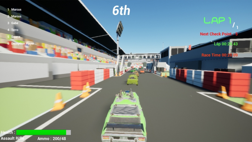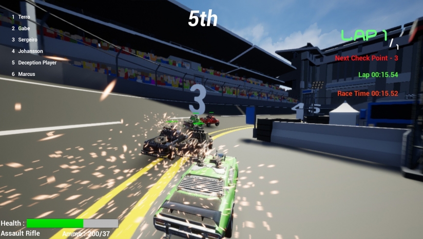 游戏包含14种不同的曲目,其中包括几个不同的熟练ai对手。玩家车有2种不同的武器,发射器和突击步枪。因此赢得比赛并摧毁敌人的对手。还有每个轨道隐藏的奖杯,这将给玩家Steam成就。玩家将驾驶肌肉武器化的汽车和ai对手的车辆是卡车和肌肉车。每场比赛持续1-2圈,视赛道而定。赛车手需要通过检查站,所以选择快捷方式不是选择。
