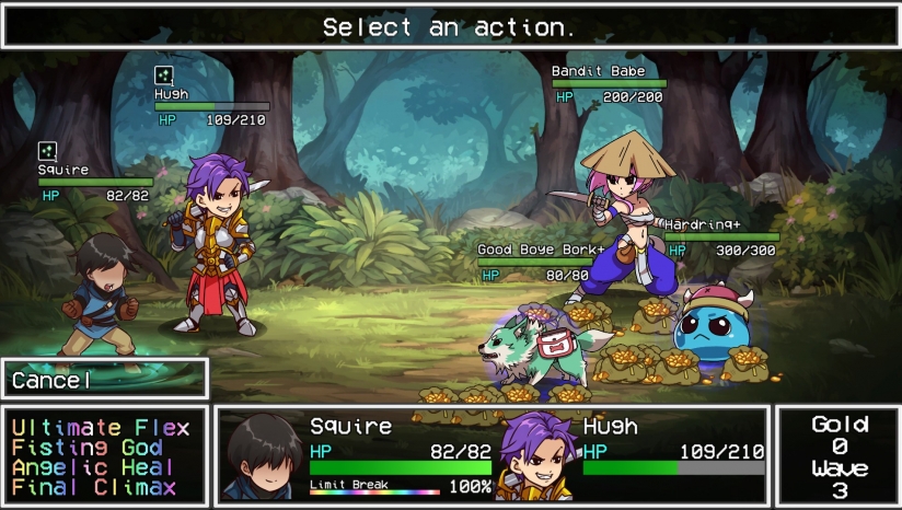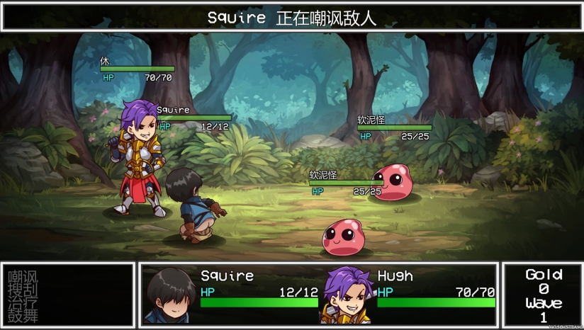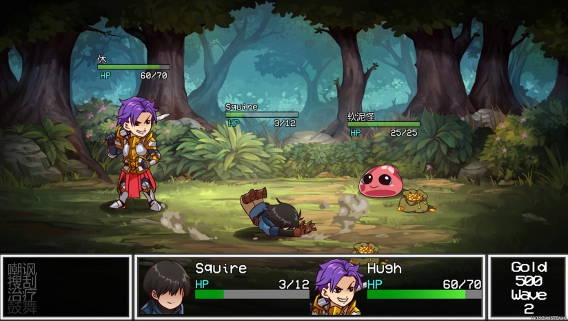 回合制战斗—— 你也许不是一位像样的侍从,但是你拥有一些非传统的特技,来让你侍奉的可怜骑士活命,使用嘲讽、鼓舞、治疗、搜刮来达到胜利!