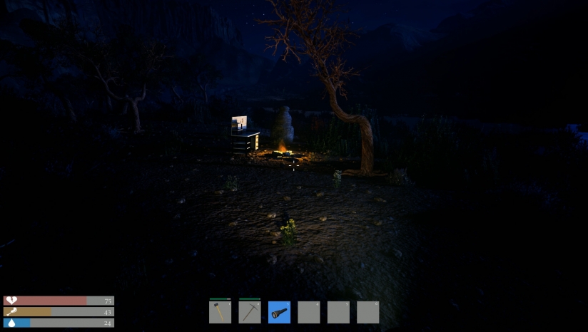 你必须找到食物和水才能生存。你可以在营火上做一些食物来获得最大的好处。监测你的健康,发烧会把你打倒,你会死,但如果必要的话,收集草药可以治愈你。