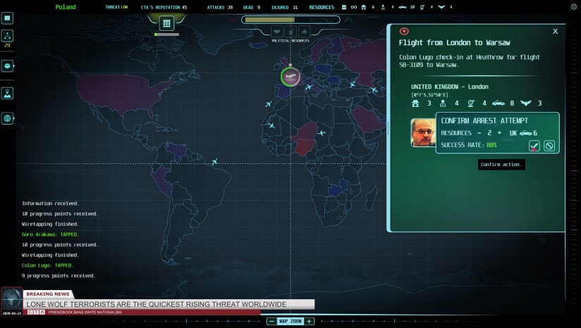 加入 CTA - Counter Terrorist Agency(反恐专家组织),一个致力于阻止恐怖袭击的国际组织,使用现代监听技术,获取情报,寻找恐怖组织网络中的头目,并且阻止灾难的发生,决定谁需要被监视,而谁需要从这个地球上消失。找到伊斯兰国在全球各地的爪牙,与美国和欧洲的极右翼激进势力作斗争,揭露邪教企图颠覆世界的狼子野心,有时作出决定很困难,但你需要快速准确地应对事态,恐怖势力仍在暗中觊觎......
