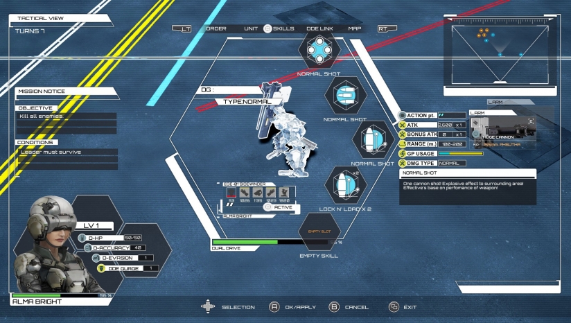 从第三视角游玩,该系统的重要的是如何命令小队多个单位,当单位移动时,敌人在射程内会攻击玩家单位。当玩家的机甲攻击会停止移动,这将使玩家制定一个策略做出准备。如果我们在改变单位或结束回合之前攻击另一个敌人或移动到新位置,这个系统的编队和资源管理便变得非常重要。