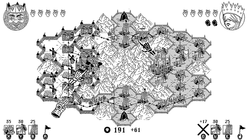 而游戏的玩法也非常简单,你只有三种建筑——矿洞,炮塔,兵营,你的敌人也如此,你们需要在一个小小的地图的六边形网格上建造建筑,将可以强化士兵的石头纳入你的领地,设定士兵的进攻路线,最终攻陷敌人的大本营。