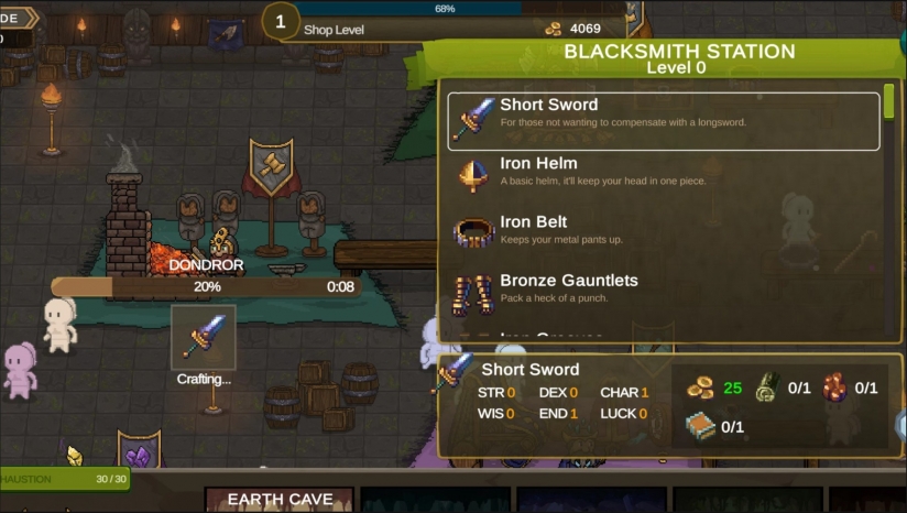 《矮人商店(Dwarf Shop)》是一款卡通风格的商店模拟类游戏。在游戏中你将扮演一名装备商店的老板,你可以命令你的手下前往矿洞挖掘材料,然后将其制作成装备出卖给冒险者。