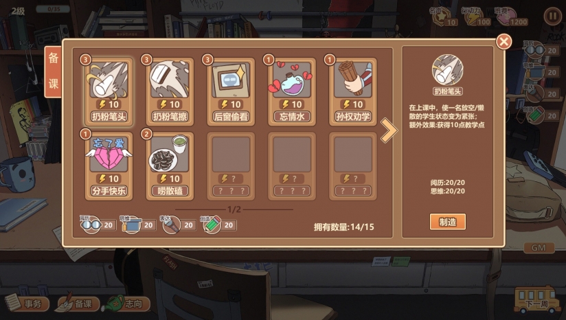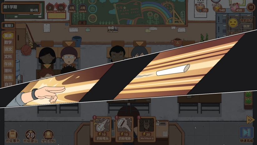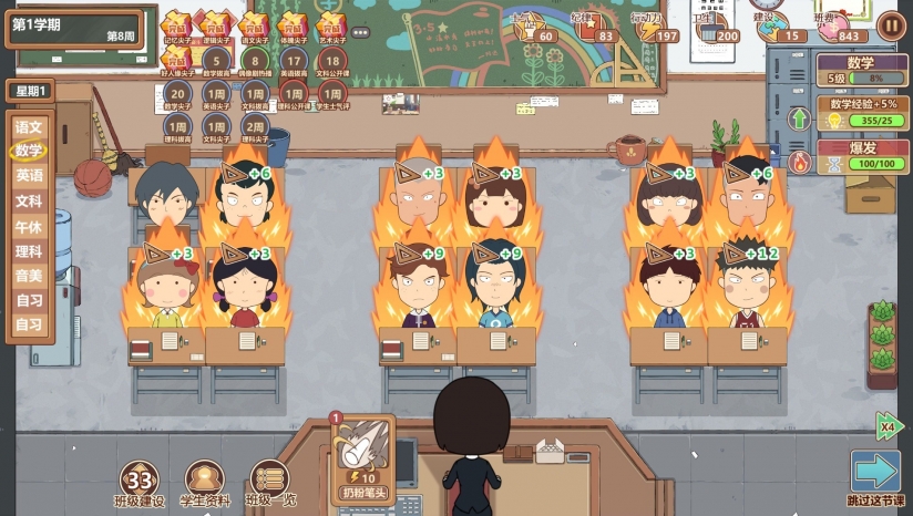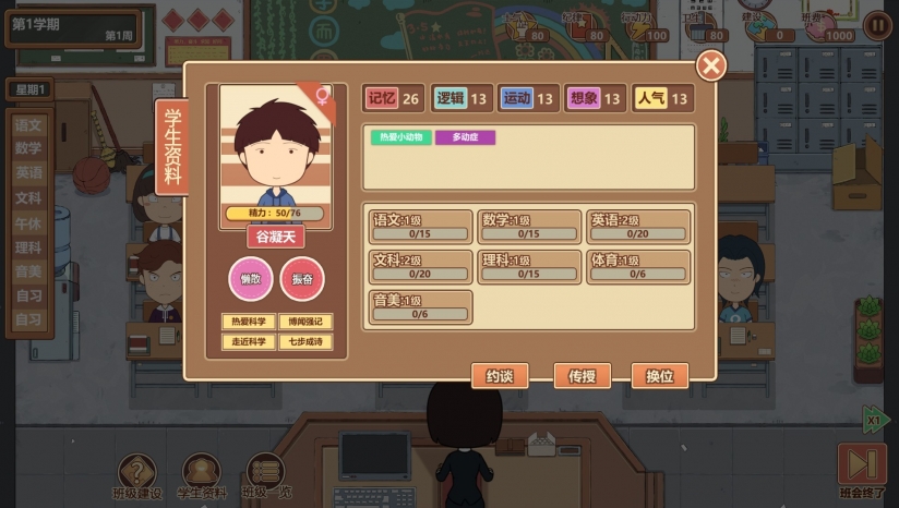 在游戏里可以通过「传授」给学生开小灶,提高能力。每周开「班会」,整顿学生风气。