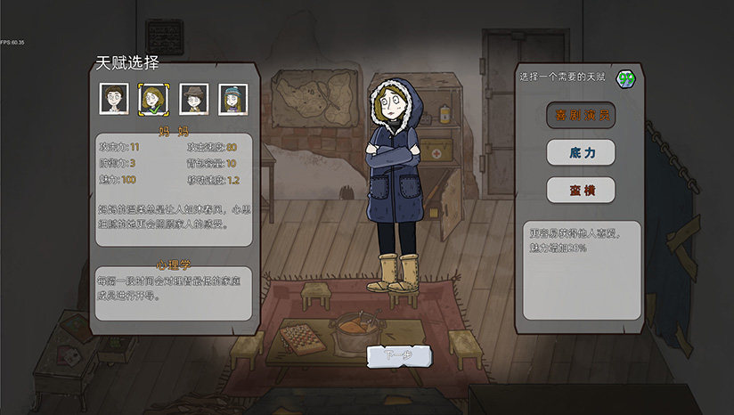 我们为主角一家设计了几十种天赋,每种天赋都会有单独的属性,从影响基本的角色属性:寒冷度,健康值,到物品的使用效果,以及影响战斗和与他人交涉结果等等。不同的天赋选择搭配可以让主角一家使用不同的方式存活下去。