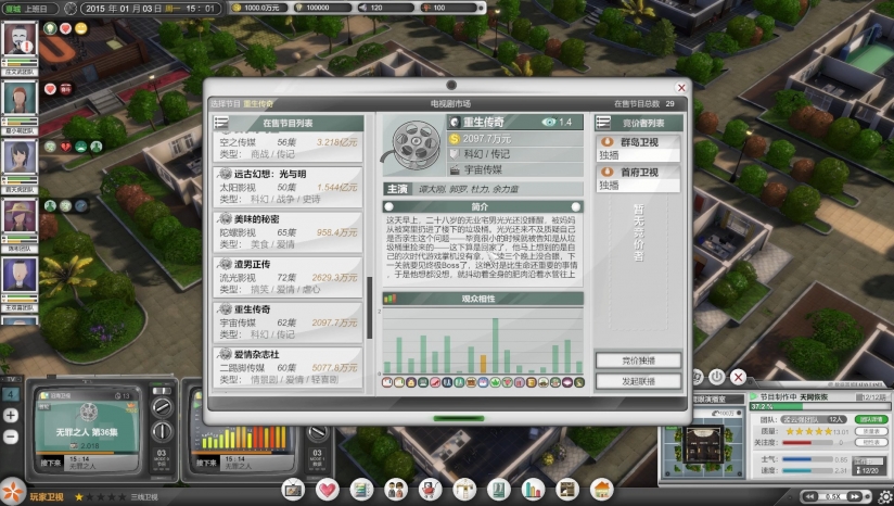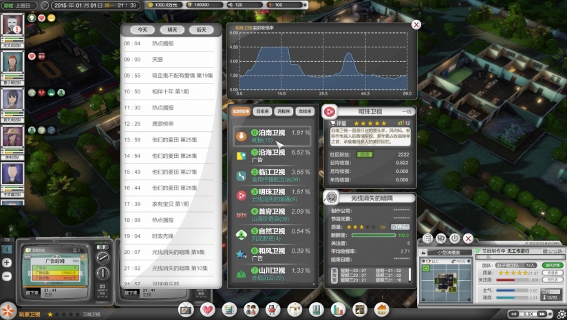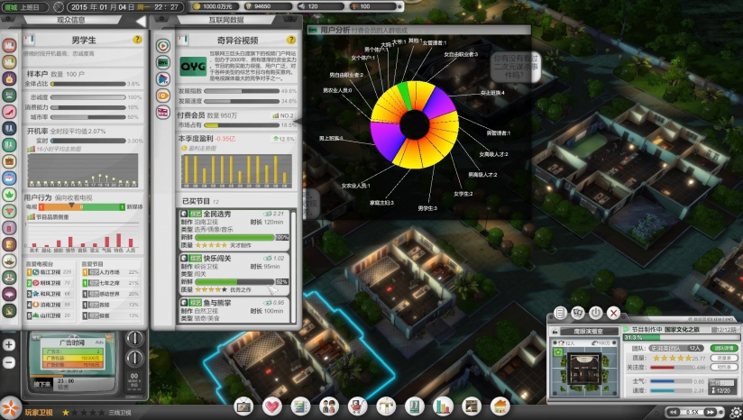 我们创建的复杂的数据模拟系统,在极大程度上还原了现实的收视规律。这套系统将人群划分为17个具有代表性的群体,每个群体根据实际比例设立了数百到数千个智能的样本户,这样仿真的系统最大的好处就是,你能最大化体验到电视行业的博弈乐趣。在游戏里,一台新节目是否能创造现象级收视,不仅与节目本身的质量参数有关,还与其平台的契合度、目标观众群体的状态、其他台的同时段节目竞争、实时事件、舆论风评等各种深层因素相关,所谓“天时地利人和”。你将很少有套路可循,即使到了大后期也处处充满挑战。有时,一个策略性的节目编排就可拯救你于水深火热,而一个小小的失误就可让你的王牌节目沦为炮灰。