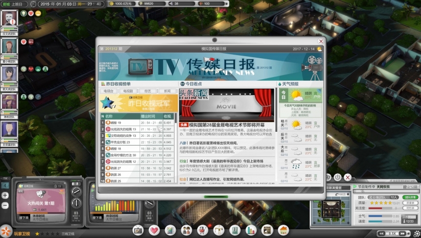 我们还创造了一个内容丰富的日报系统,这个系统本身也是上述舆论系统的一部分,这个系统每天都会更新前一天电视台所有节目的收视榜单,而那些冠名商和广告商就会参考这些榜单来选择做谁的金主(当然,收视率并不是他们参考的唯一因素)。同时,日报产生的事件都会对这个世界造成影响。比如,一个明星的负面新闻不仅会导致他本人掉粉,还会影响到他正在播出的各种节目;再比如,世界性的体育赛事进行时,体育新闻和体育元素的综艺将得到额外的关注度。