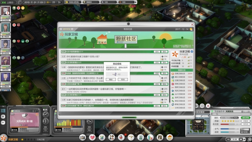 这是我们的创新,你会在游戏中看到一个模拟的观众社区,这可以说是一个“论坛模拟器”,你播出的节目都会在这个模拟的社区里看到反馈,而这些反馈正是舆论的水花,舆论则会反过来对节目和电视台产生影响,而那些发帖者便是上述的智能样本户,他们有的会夸夸其谈对节目的看法,有的会给你的编排提出建议,还有很多毒奶……总之,这是一个活跃的丰富多彩的社区,有趣的玩点很多,比如:如果你做的节目一直让你的某个样本户粉丝不满意,他可能会成为黑粉,并不断发出质疑的言论,如果他的帖子浏览量较多,将会带动一些人脱粉。当然,如果你有足够的影响力点数,你就可以对舆论进行操控。