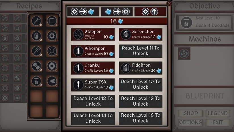 资源管理:要想成功毕业,你必须小心地平衡你的零件,光泽和机器。商店里只能出售小部件和后续零件。因此,如果你没有零件来制作小部件,没有闪亮的东西来购买零件,你可能会失败。机器有过度生产一部分或另一部分的倾向,消耗宝贵的资源。如果你的机器失控,你可能会失败。