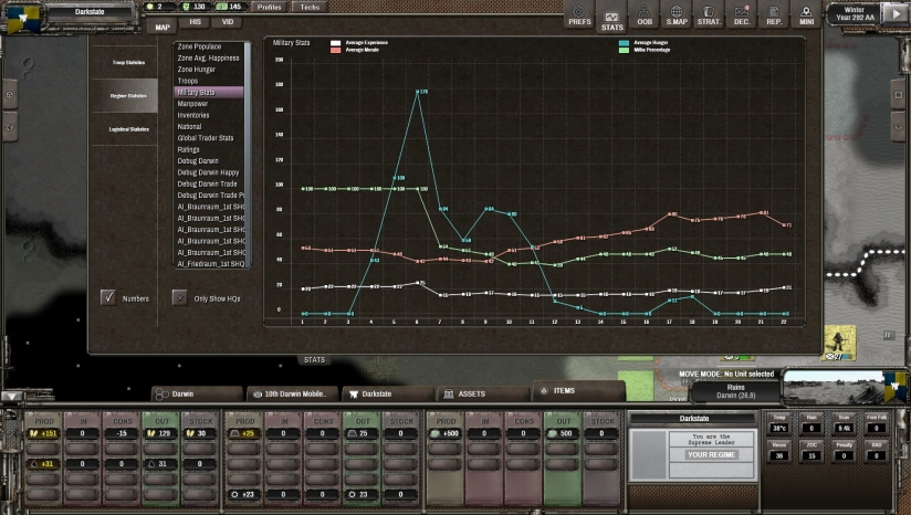 现实的供应模型中,物资耗尽总会有后果。缺乏石油会使你的部队无法调动,缺乏弹药会阻止任何进攻行动,而缺乏食物可能会导致你的军队和平民挨饿和死亡。