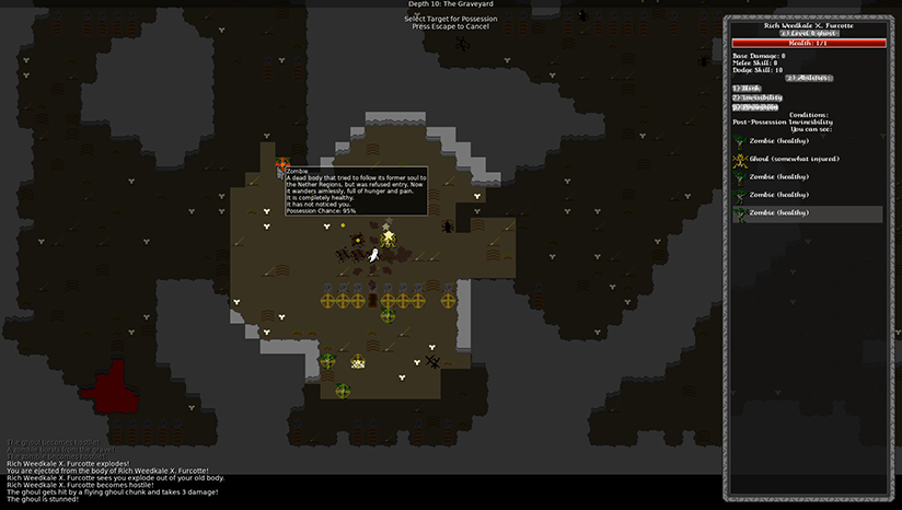 占有是一种基于回合的传统roguelike,在这里您扮演鬼魂的角色试图进入地面。您非常虚弱,但有一个优势:您可以拥有遇到的怪物的身体,并以自己的力量和能力来使用。当您尝试使其回到表面时,从一个身体跳到另一个身体。