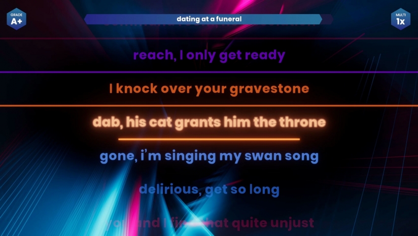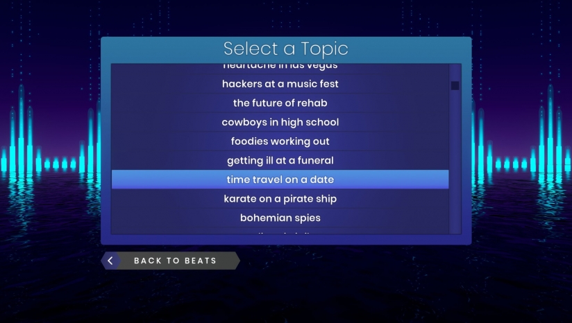 1人《押韵风暴(Rhyme Storm)》是一款街机风格快节奏的音乐游戏。在游戏中你将化身为一名专业的说唱歌手,然后选择自己要唱的歌词,每句都有不同的韵脚,然后你就能唱出一首非常好听的英文Rap,可以说是一款埃米纳姆模拟器。