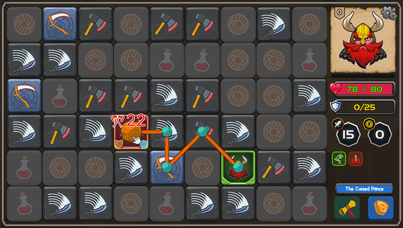 《矮人与地城》与传统的战斗类消除游戏不同,将战斗部分和消除部分进行有机结合,不再是“消除→战斗”的顺序运行,而是将你控制的角色置于消除棋盘中,所有消除动作都必须从角色所在位置发起,在消除的同时完成角色的走位。