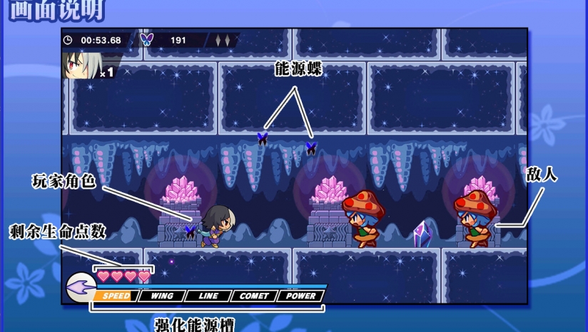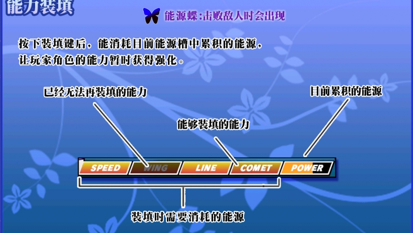 在打倒敌人后将出现「能源蝶」,玩家可透过它来强化主角姬丝,