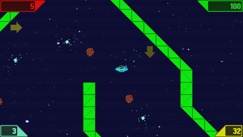 在宇宙中的飞碟上呼啸而过,躲避小行星,黑洞,加农炮射击和各种各样的障碍物,拾起水晶。通过30个障碍物填充级别进行推力,躲避和加速。