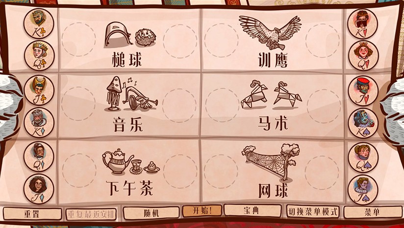 荒蛮的梅花王国会向红心王国宣战吗?魔法盛行的黑桃王国和遍地金银的方片王国是宿敌,可黑桃王子约翰和方片公主朱莉却坠入爱河。他们能否成功私奔?黑桃国王和黑桃王后奇怪的婚姻又是怎么回事?红心国王会不会发现蛛丝马迹,嗅到他忠诚的乔治公爵与他的妻子之间的不当关系?当你摸索12位宾客的好恶以便安排日程时,也要把这些问题纳入考量。发掘真相,引导结局,这就是你能为仙境世界所做的一切。