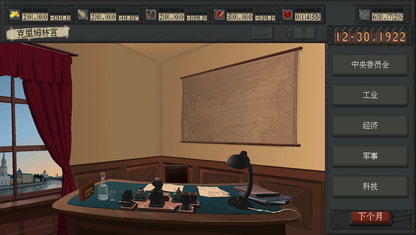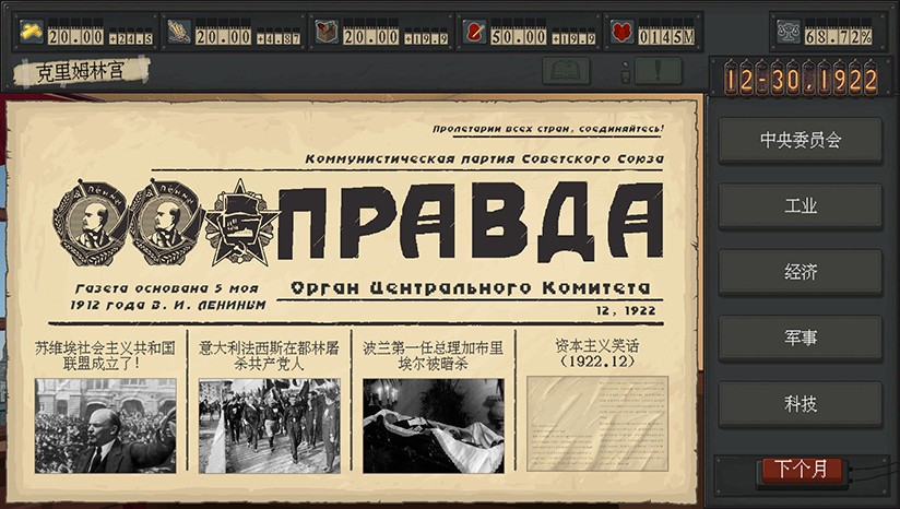Make USSR Great Again! 从1922年12月30日开始扮演苏维埃社会主义共和国联盟最高权力机构,没人比你更懂苏联了! 在这款回合制战略游戏中,掌控国家的政策、经济、工业、军事、外交等事务。