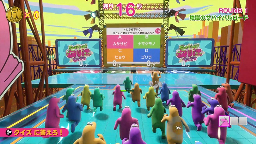 《Survival Quiz CITY》是由万代南梦宫制作,Phoenixx Inc.发行的一款综艺向多人欢乐生存游戏,在游戏中玩家将需要控制自己的角色,闯过一个个难关,并且还要正确回答问题,若是失败,就只能在崎岖的道路上前进,成功者是依靠自己的头脑顺利生存下去的。